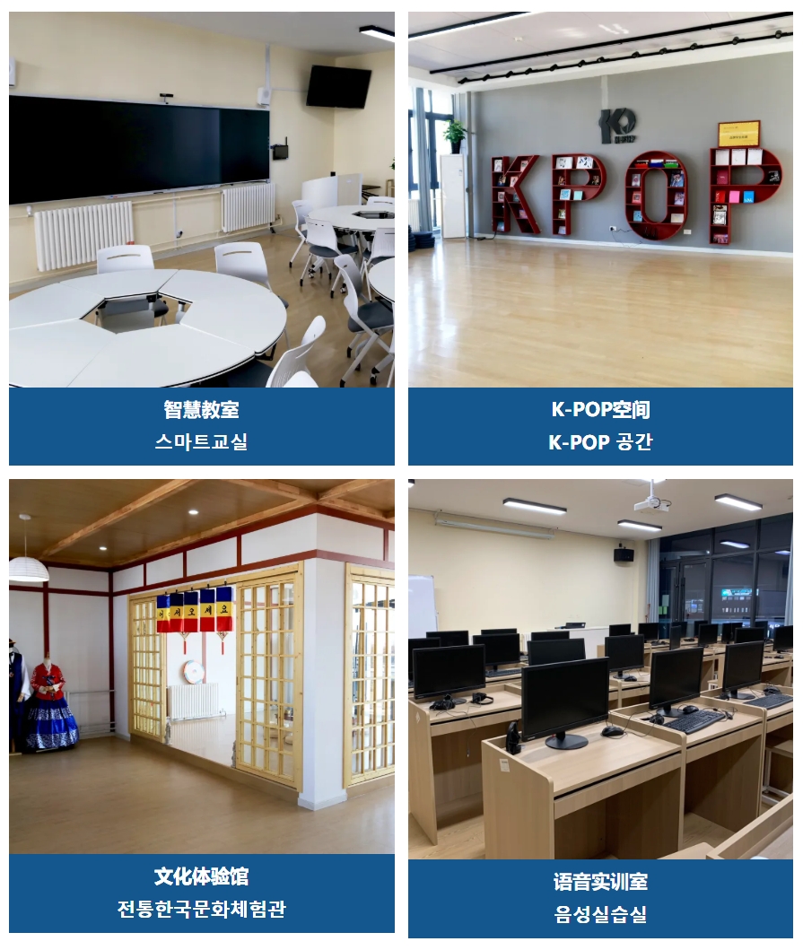 신언서원(新言書院)에 위치한 중한대학은 뛰어난 한국어 교습을 위해 첨단 설비를 포함한스마트교실과 음성실습실,전통한국문화체험관, 다목적 회의실, 장서가 풍부한한국서적열람실등을 갖추고 있습니다. 이러한 시설은 학생들에게 풍부한 학습자원과 편안한 자율공부 및 세미나 공간을 제공합니다. 또한 육영서원(育英書院)에는태권도장, K-POP 공간, 중한악기 체험실, 한식카페, 창의주방등 다양한 활동공간을 마련하여 학생들에게 포괄적이고 다양한 생활환경을 조성하고 있습니다.