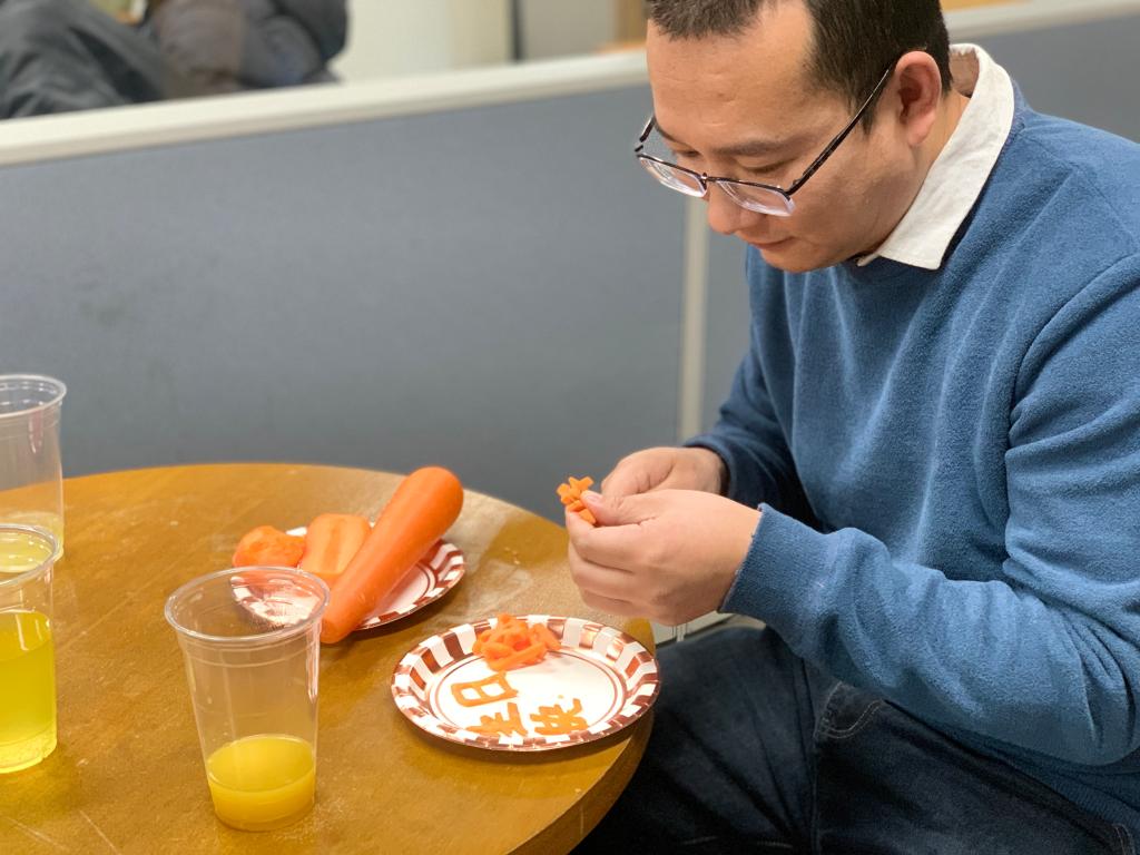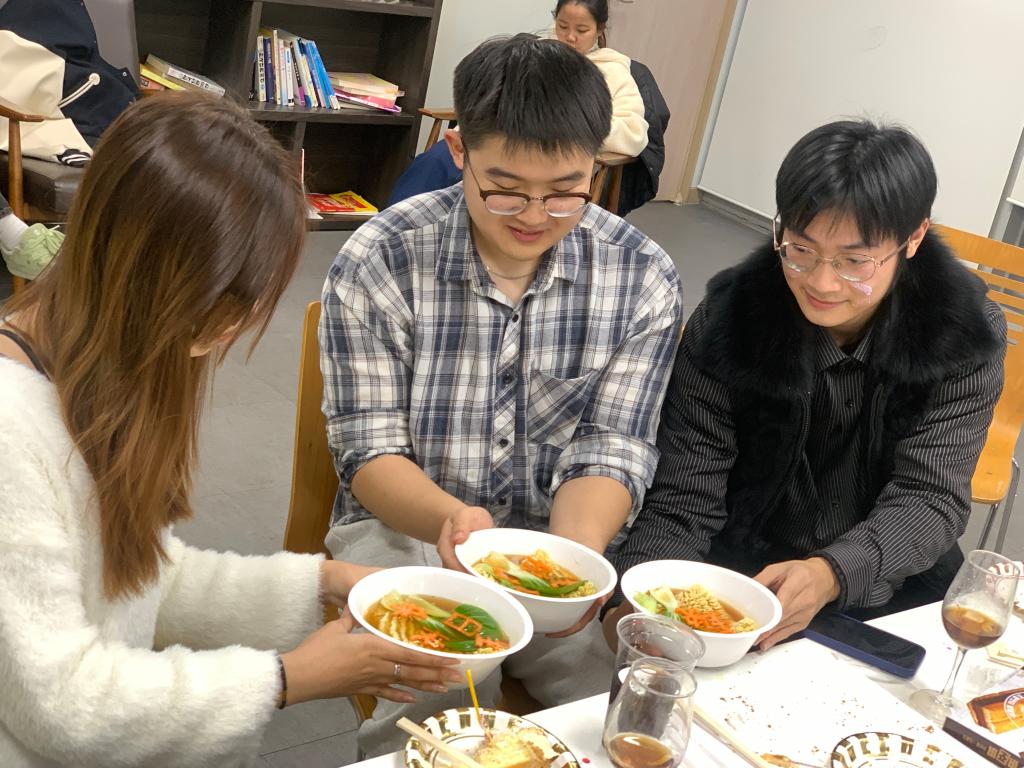 长寿面代表着“平安喜乐”的祝福,欧阳老师亲手把红萝卜雕刻成了“生日快乐”的字样,摆放在长寿面里,更是对寿星们深深地祝福之情。同学们将这热腾腾的长寿面送上,寿星们品尝着美味的面条,感受这份独特的喜悦和幸福。