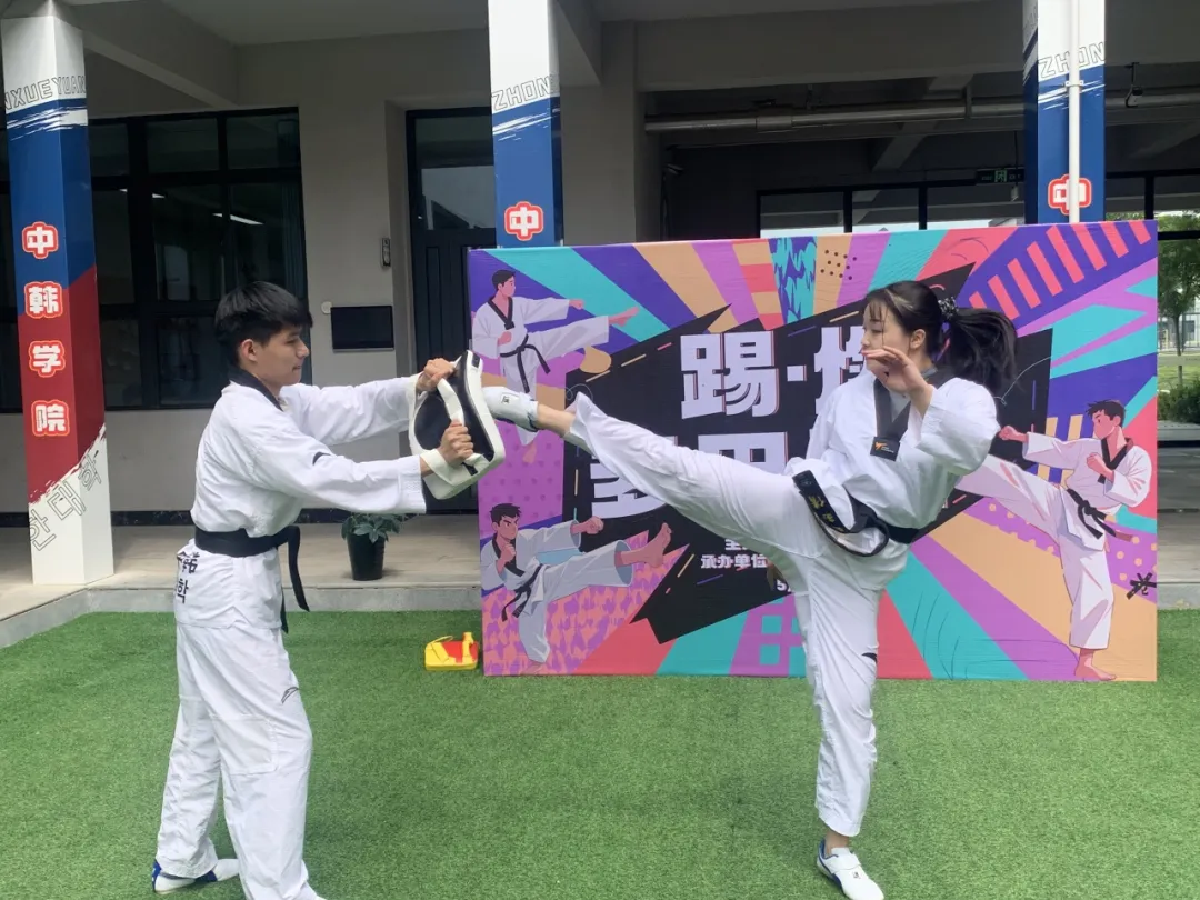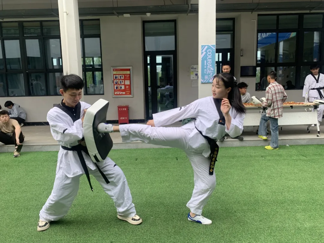 随后,王老师为同学们带来了一场精彩的专讲。她表示:"跆拳道作为韩国的国粹,不仅是一项体育运动,更蕴含着'礼义廉耻、忍耐克己'的精神内涵,这与我们倡导的心理健康教育理念高度契合。"特别值得一提的是,她还现场演示了传统跆拳道与现代的结合应用,让在场师生大开眼界。