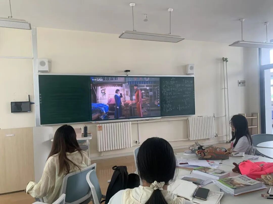 现场通过暗场投影与环绕音效设计,打造沉浸式观影环境。员工们手持学院准备的《K-POP文化关键词手卡》,全程专注观看影片,不少人认真记录关键知识点。当屏幕播放到BTS格莱美表演片段时,现场自发响起轻呼声,部分员工跟随节奏轻声哼唱;经典组合的复古舞台画面引发集体回忆,席间不时传来对舞蹈细节、音乐风格的交流探讨。影片结束后,师生仍沉浸在内容氛围中,不少人主动停留交流观影感受,形成自然的文化讨论场景。