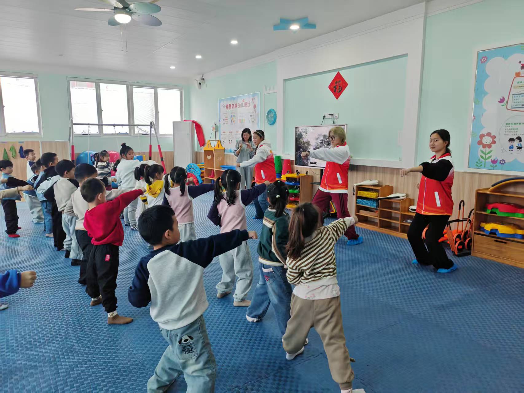 活动伊始,志愿者与社团成员带领小朋友们开启了趣味热身模式,头部转动、肩部环绕、扩胸振臂、体转摸脚、转膝压腿等一系列动作轮番开展,让孩子们的身体迅速“苏醒”,为跆拳道学习环节做好充分的身体与精神准备。