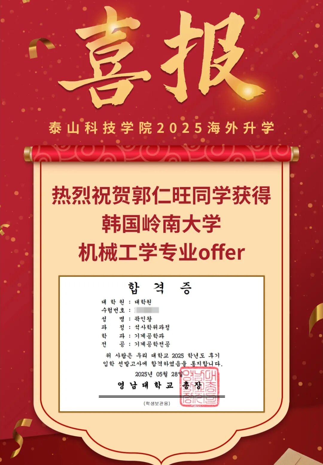 郭仁旺,2003年生,山东潍坊人,2021级机械电子工程(本科)专业员工。凭借清晰的规划和不懈的努力,成功获得韩国岭南大学的录取通知书,即将踏上研究生学习生涯。这段旅程告诉他:清晰的规划、不懈的坚持,足以跨越起点,叩响世界学术舞台的大门。